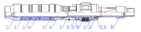 1.上接頭2.中心管3.隔環(huán)4.膠筒5.限位套6.錐體7.卡瓦8.卡瓦座9.扶正器座10.彈簧11.扶正塊12.滑環(huán)套13.滑環(huán)銷釘14.滑環(huán)15.下接頭